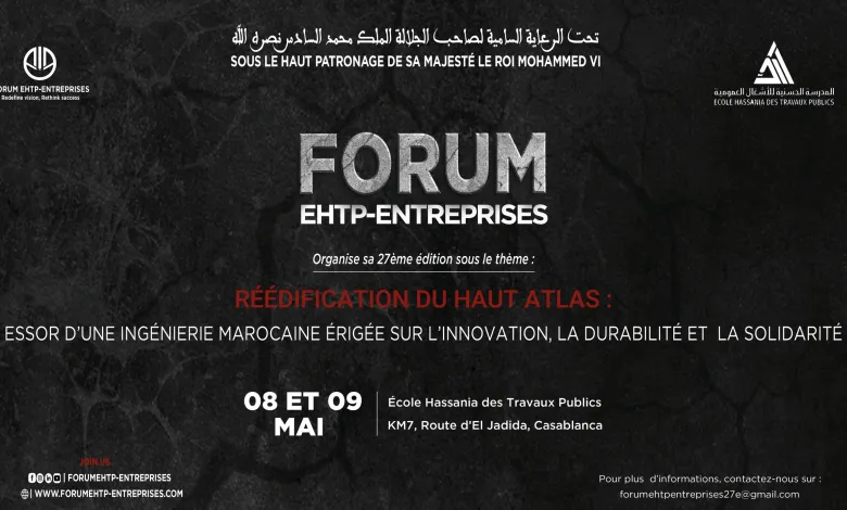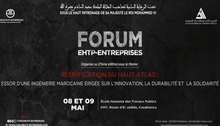 La 27e édition du Forum entreprises de l’École Hassania des Travaux Publics (EHTP) prévu  du 7 au 9 mai courant à Casablanca, sous le thème « Réédification du Haut Atlas: Essor d’une ingénierie marocaine érigée sur l’innovation, la durabilité et la solidarité », est un grand salon estudiantin, organisé annuellement par des étudiants de l’Ecole Hassania des Travaux Publics qui rassemble des acteurs majeurs du monde professionnel et économique, ainsi que des experts et des chercheurs pour discuter des enjeux et défis auxquels notre pays fait face, souligne un communiqué de l’EHTP.